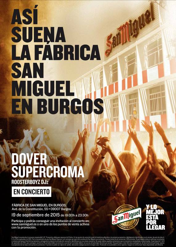 El sábado 19 de septiembre a las 19:00 horas la fábrica de San Miguel en Burgos abrirá sus puertas a los ciudadanos con EXPLORING CONCERTS, un mini festival gratuito con DOVER, SUPERCROMA y ROOSTERBOYZ DJz. La entrada es gratuita a través de invitación por medio de los locales más conocidos de la ciudad y a través de la web de la marca y en twitter con el hashtag #ExploringConcerts.