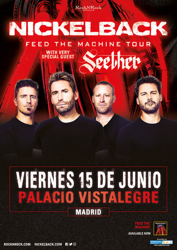 NICKELBACK comenzará su gira europea en Glasgow el 3 de mayo y anuncia concierto único en España para presentar «Feed the machine». Sera el viernes 15 de junio en el Palacio de Vistalegre acompañados de SEETHER. La preventa para el club de fans será a partir de hoy a las 12:00 horas. Para el resto las entradas estarán disponibles a partir del jueves 7 de diciembre a las 10:00 h (hora peninsular) a través de la web de RocknRock y a través de la red de Ticketmaster (Fnac, Viajes Carrefour, Halcón Viajes).