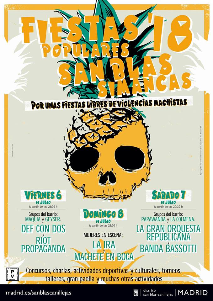 Los días 6, 7 y 8 de julio en el Barrio de San Blas / Simancas de Madrid tendrán lugar las fiestas populares con la reivindicación de unas fiestas sin violencia machista. Para estos días contaremos con conciertos de rock como: