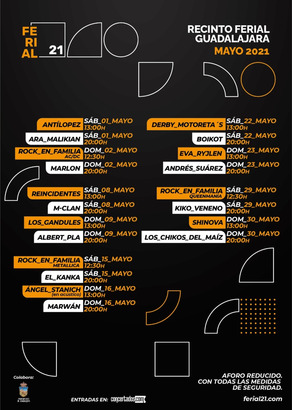 Ferial 21 es un ciclo musical que tendrá lugar en el mes de mayo en Guadalajara. Serán conciertos al aire libre que contará con artistas como M-Clan, Reincidentes, Ángel Stanich, Eva Ryjlen, Marlon, Boikot, Albert Pla, Marwan, Shinova o El Kanka, entre otros.