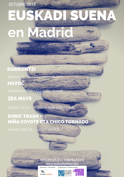 La segunda edición de EUSKADI SUENA EN MADRID llega estos días para dar a conocer la cultura vasca en la capital. Euskadi Suena… en Madrid”*  se desarrollará entre el 15 y el 29  de octubre con diversos conciertos donde se podrá ver a Korrontzi, Havoc, Zea Mays  y Sonic Trash que tocará junto a Niña Coyote eta Chico Tornado.