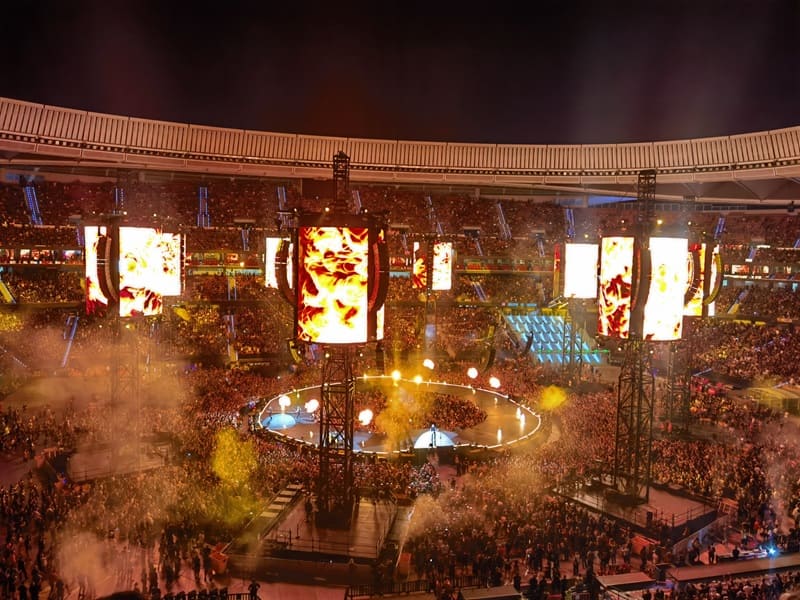 La banda ha desplegado toda una escenografía que demuestra músculo e ideas, porque distribuye su escenario en la parte central del Cívitas Metropolitano , todo en forma de dónut y ocho pantallas cilíndricas en alto que se reparten alrededor.
