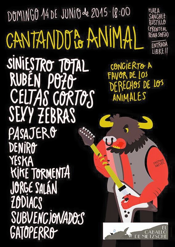 El próximo domingo 14 de junio a partir de las 18 horas se celebrará un evento musical llamado CANTANDO A LO ANIMAL un concierto de diversos artistas en favor de los derechos de los animales. El mismo será gratuito en la Plaza Sánchez Bustillo, enfrente del Museo Reina Sofía de Madrid. Contará con SINIESTRO TOTAL, RUBÉN POZO, SEXY ZEBRAS, CELTAS CORTOS, PASAJERO, DENIRO, YESKA, KIKE TORMENTA, JORGE SALÁN, ZODIACS, SUBVENCIONADOS y GATOPERRO.