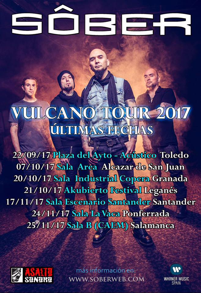 El grupo de rock SÔBER ha anunciado las últimas fechas de presentación de «Vulcano». Tras el verano y los festivales la banda vuelve a las salas pasando por Toledo, único concierto en acústico en la Plaza del Ayuntamiento, Leganés (Festival Akubierto), Santander, Ponferrada y Salamanca. Detalles en el cartel y entradas en Ticketea.