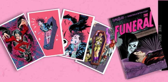 “Estas poderosas novelas gráficas sirven como un espejo de mi propio viaje como artista a través de un medio que adoro absolutamente”, dice YUNGBLUD. “Los volúmenes anteriores relataron mis batallas con la autoridad, la identidad y la autoexpresión. The Funeral, como su contraparte musical, lidia con la idea de la autoaceptación, la pertenencia y la búsqueda de la paz con tus propias inseguridades”.